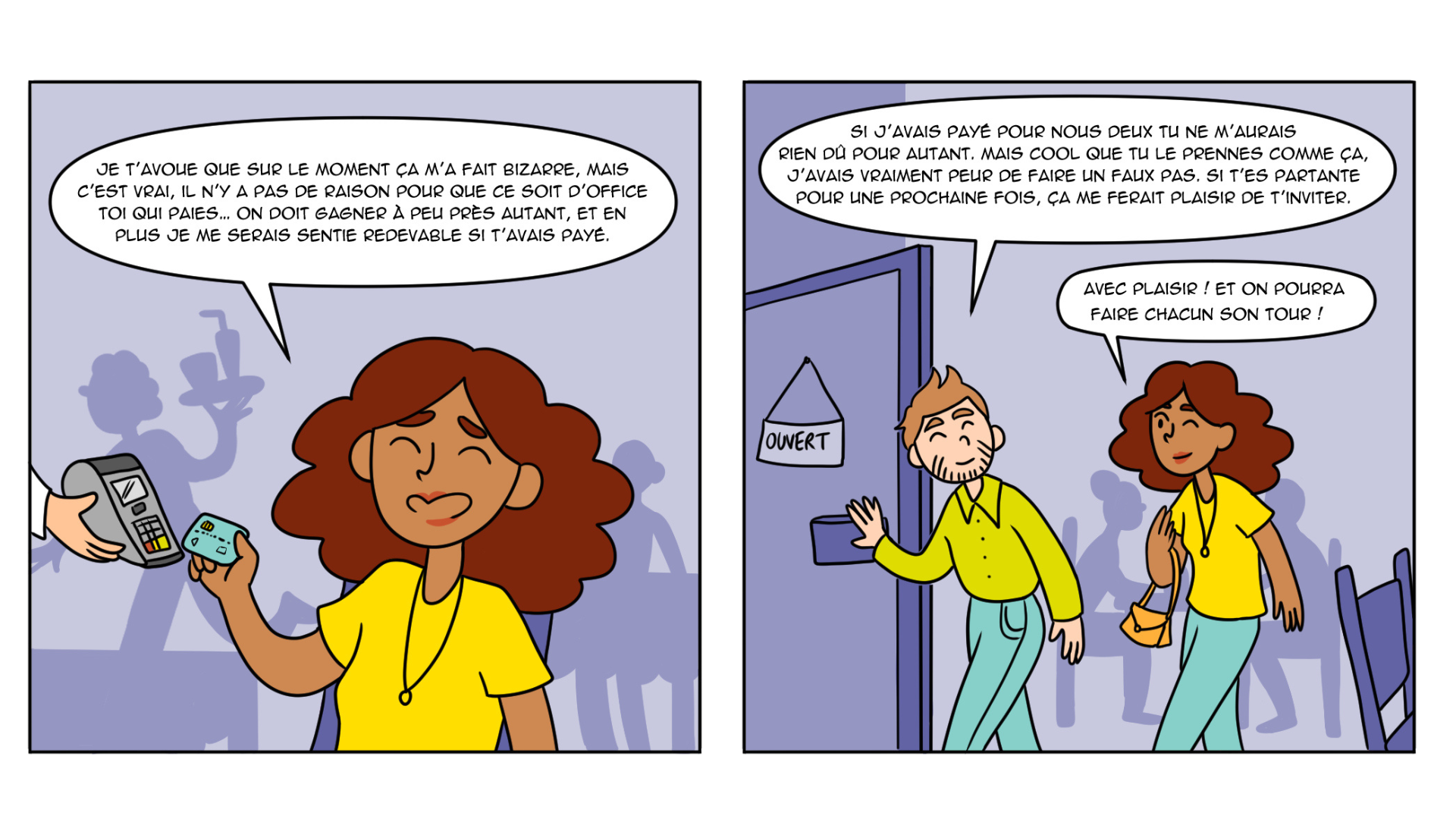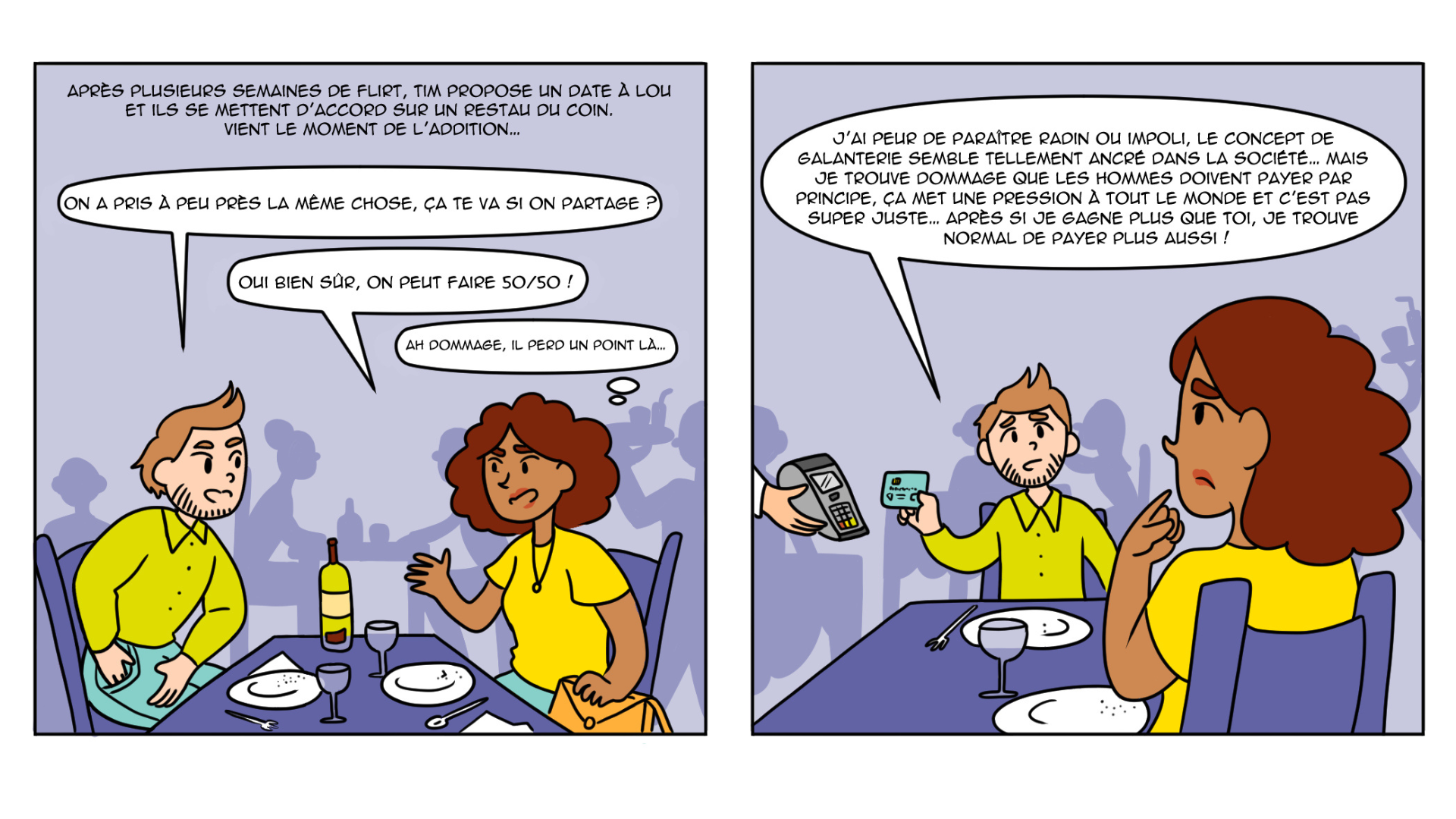 Cette bande dessinée à été illustrée par Morgane (graphiste) et écrite par Morgane (la fondatrice). Elle est tirée de la fiche “Premier date : qui paie l’addition ?”