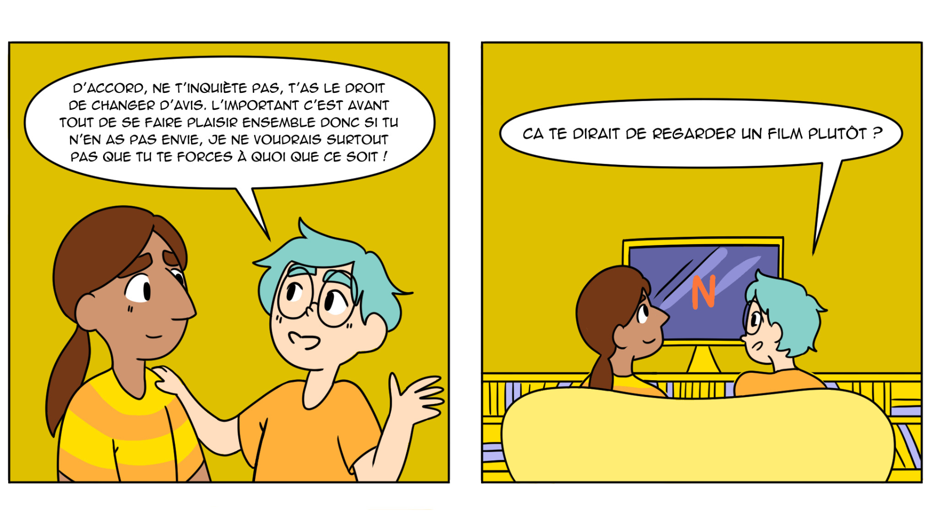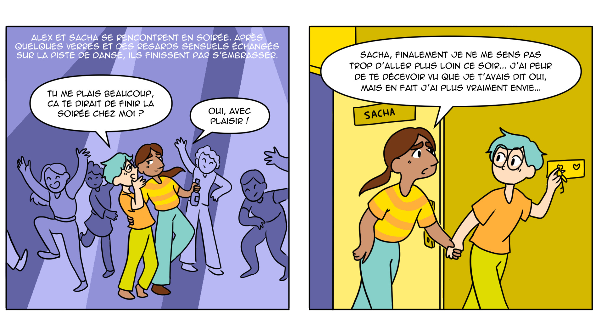 Cette bande dessinée a été illustrée par Morgane (graphiste) et écrite par Morgane (la fondatrice). Elle est tirée de la fiche “Comment s’assurer du consentement de l’autre ?”